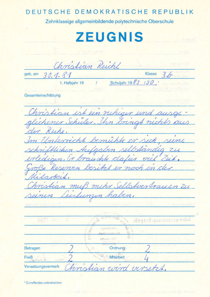 Als schließlich die Weichen für die deutsche Wiedervereinigung gestellt wurden, ergaben sich auch in Christian Reichls Schulalltag Veränderungen: Das Verhalten und Auftreten der Lehrerinnen und Lehrer war anders und das Schulsystem wurde schrittweise dem westdeutschen Modell angepasst.