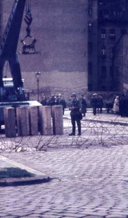 Auch an der Ruppiner Straße wird mit Stacheldrahtrollen die Sektorengrenze blockiert. Die bewaffneten Posten halten die Menschen in Ost-Berlin gezielt auf Abstand. Bald setzen Kranwagen die ersten Mauerelemente auf die Straße und riegeln sie dauerhaft ab.
