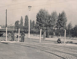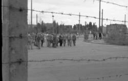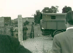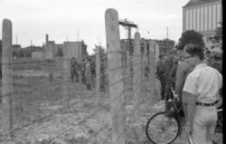 Am Potsdamer Platz verläuft die Sektorengrenze quer über die kriegszerstörte Brache. Zunächst werden die Eingänge zur S-Bahn mit Stacheldraht gesperrt, dann ein Stacheldrahtzaun mit Betonpfosten aufgestellt. Von Westen kommen die Menschen bis an den Stacheldraht heran.