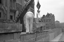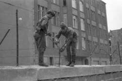 Anfangs können die Menschen über die noch relativ niedrige Mauer Kontakt aufnehmen. Doch bald wird die Grenzmauer hier durch weitere Betonschichten und Stacheldrahtaufsätze erhöht.