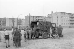 West-Berliner Polizei am Alfred-Döblin-Platz und US-Soldaten an der Prinzenstraße beobachten die Erhöhung der Mauer und die Absicherung der Sektorengrenze. Sie greifen jedoch nicht ein und halten die West-Berliner Bevölkerung von Protesten und Provokationen ab.