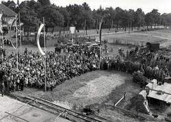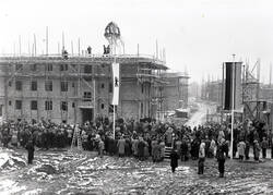 Can you see the stone plaque on the front of the house? If so, can you read the date on it? You may find reading the historical photo in the guide easier: It is June 30, 1952. The foundation stone for the Marienfelde Refugee Center was laid on this day. The man in the photo placing the foundation stone certificate on the wall is Otto Bach, then Berlin’s Senator for Social Affairs.